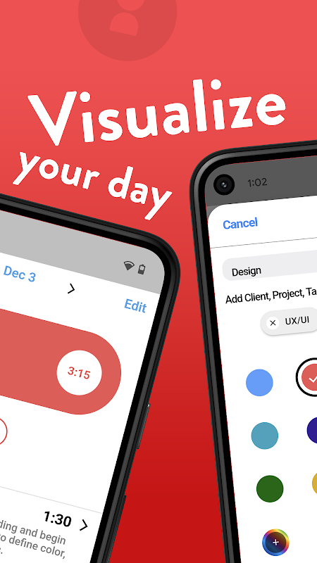 Pelacakan waktu tidak harus hambar atau membosankan. Dengan palet warna dari 15 warna berani dan pemilih warna khusus di ujung jari Anda, Anda memiliki ratusan opsi yang tersedia untuk menjadikan UI Anda penuh warna dan unik seperti Anda.