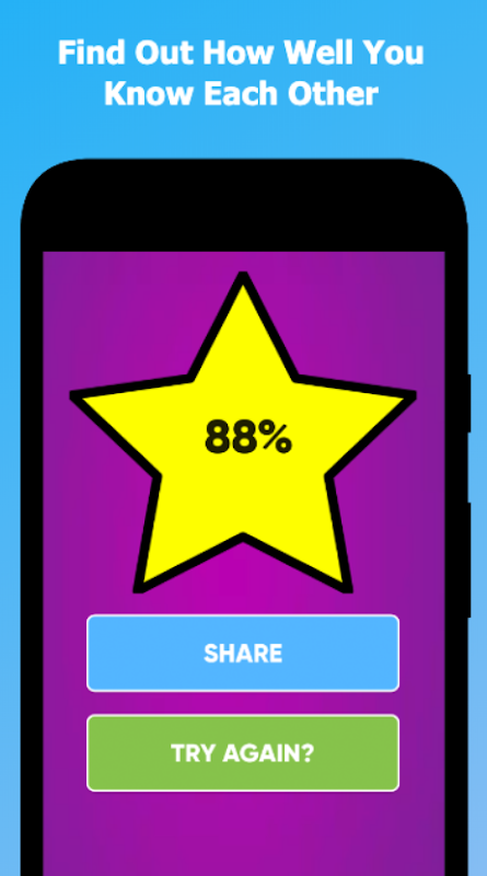 Kuis ini menghitung seberapa banyak Anda dan teman atau pasangan Anda saling mengenal setelah menjawab serangkaian pertanyaan. Untuk bermain, pertama-tama jawab pertanyaan tentang diri Anda sendiri. Kemudian berikan perangkat kepada teman yang bermain dengan Anda dan biarkan mereka menjawab pertanyaan yang sama, mencoba mencocokkan jawaban mereka dengan jawaban Anda. Di akhir permainan, Anda akan mendapatkan skor total seberapa baik mereka mengenal Anda!