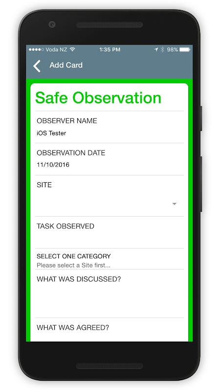 This application is used to record, categorise and submit observations of safe and unsafe behaviours on specific Worley construction sites.