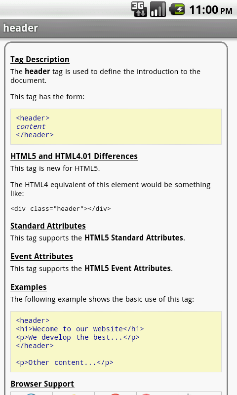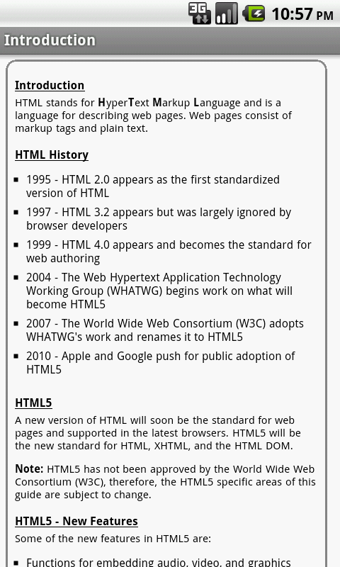 Catatan: Aplikasi ini berisi informasi HTML4, tetapi tujuannya adalah untuk fokus pada HTML5. Sebagai spesifikasi HTML5 berlangsung menuju persetujuan, update aplikasi ini akan mengikuti perubahan-perubahan dan berkembang ke arah spesifikasi HTML5.