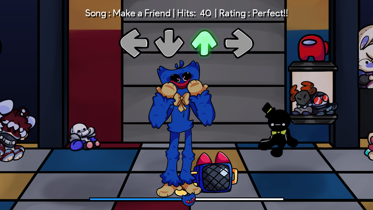 This game works perfectly offline, You can play it using four buttons to create your own unique hit to the music of playtime Huggy Wuggy FNF Mod Character.