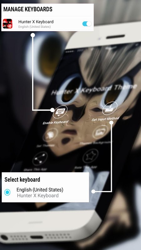 Dapatkan tema keyboard Hunter X dan berikan ke keyboard ponsel Anda dan masukan teks keyboard keren untuk penggemar tema Kirua dan Gon.