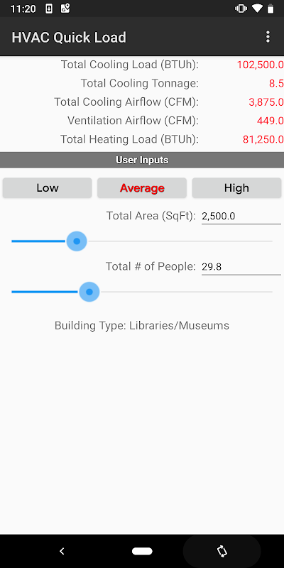 The HVAC Quick Load for Android is the one and only rule-of-thumb HVAC heating and cooling load application for Google Android mobile devices. This app performs rule-of-thumb HVAC cooling and heating load calculations for many types of commercial, industrial, institutional, and residential buildings. It allows you to quickly calculate the total required cooling and heating loads (in BTU/hr or Tonnage) and air flows (CFM or L/s) by inputting just the building type, total square area and number of people.