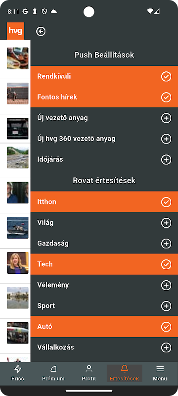 • Teljes hirfolyam – Kövesd, ami érdekel, használd a melletti plusz jelet, es megkapod a naprakész listát a téged érdeklő témákban íródott cikkekkel: politika, gazdaság, budaya, IT, olahraga, misalnya, gasztronomia, karrier vagy vállalkozás – minden rovat elérhető.
