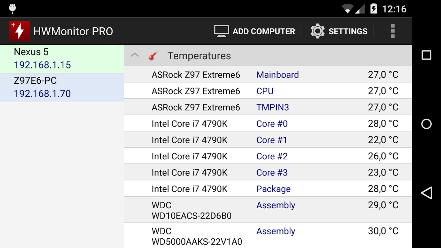 Jalankan HWMonitor PRO pada perangkat Android mobile Anda, lalu pilih Add Perangkat dari menu aplikasi atau klik pada ikon komputer di bar tindakan. Kemudian masukkan nama atau alamat IP dari mesin, dan pilih OK. Pilih mesin dalam daftar untuk memulai koneksi.