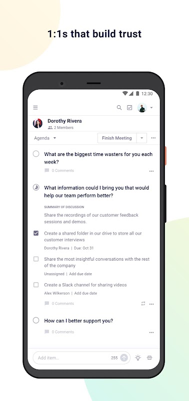 Create customizable meeting agendas for your one-on-ones, team meetings and other recurring meetings.