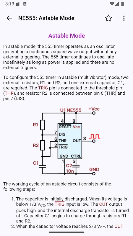 Selain tutorial dan skema, aplikasi ini menyertakan kalkulator bawaan untuk frekuensi, pewaktuan, siklus kerja, dan estimasi nilai komponen, membantu pengguna dengan cepat menghitung dan menyesuaikan parameter rangkaian. Semua topik disajikan dengan diagram rangkaian yang jelas dan penjelasan yang detail.