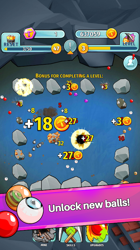 Anda memulai petualangan Anda dengan seperangkat alat penambangan yang sederhana dan tidak umum - bola dan jari Anda. Sekilas, alat-alat itu mungkin tampak tidak terlalu berhasil dalam penambangan sumber daya, tetapi ada beberapa peningkatan yang dapat membuat menganggur menjadi senjata yang sangat ampuh. Dalam game ini, mekanika penambangan yang terinspirasi dari game lawas seperti breakout atau arkanoid digabungkan menjadi pengalaman clicker yang menyenangkan dan diperluas.