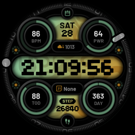 - 6 Slot Komplikasi (Saat KOSONG dipilih, detak jantung, kemajuan langkah, kemajuan waktu hari ini, dan persentase baterai ditampilkan)