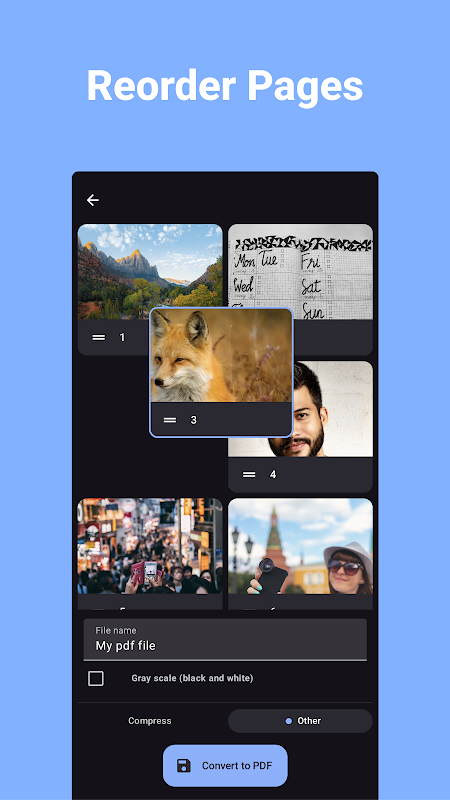 Pilih gambar Anda, atur dalam urutan yang Anda inginkan, dan lihat mereka berubah menjadi PDF yang rapi dalam sekejap. Aplikasi ini adalah solusi cepat Anda untuk membuat dokumen PDF dari perangkat seluler Anda. Dengan desain yang ramah pengguna dan efisien, tidak perlu perangkat lunak tambahan.