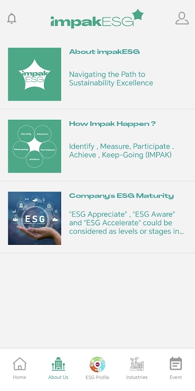 Aplikasi Seluler impakESG, alat untuk keunggulan keberlanjutan. Visi impakESG komunitas yang terhubung untuk keberlanjutan. Memberdayakan organisasi untuk bergabung dalam gerakan keberlanjutan global melalui teknologi.