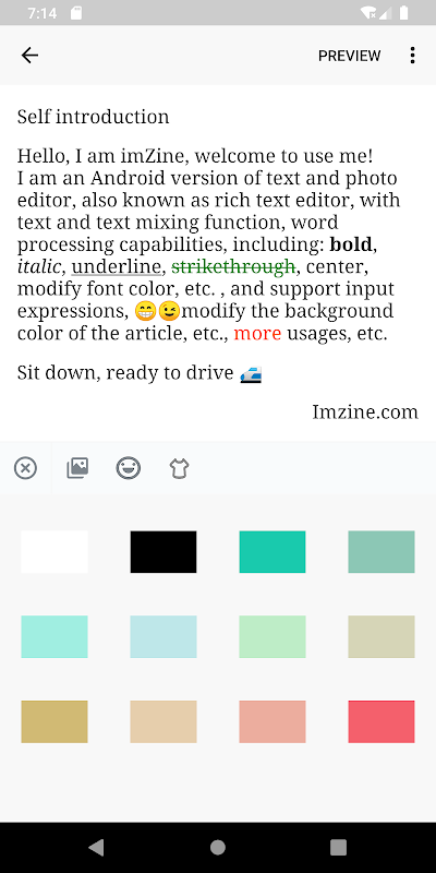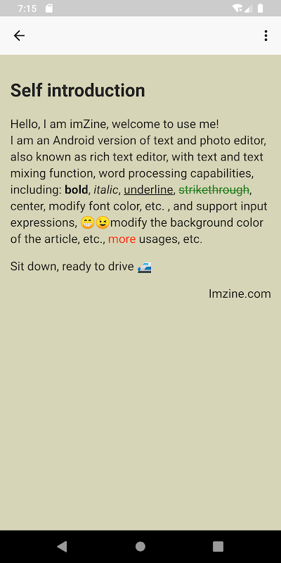 Saya adalah versi Android dari editor teks dan foto, juga dikenal sebagai editor teks kaya, dengan fungsi teks dan pencampuran teks, kemampuan pengolah kata, termasuk: tebal, miring, garis bawah, dicoret, tengah, memodifikasi warna font, dll., Dan dukungan masukan ekspresi, modifikasi warna latar belakang artikel, dll., lebih banyak penggunaan, dll.