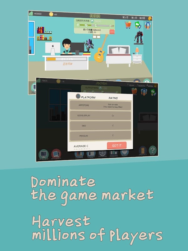 "Indie Developer" is a SIM game, you are an indie game developer, through your own efforts to develop excellent games, finally, you will get millions of faithful supporters of the game, leading the game market.