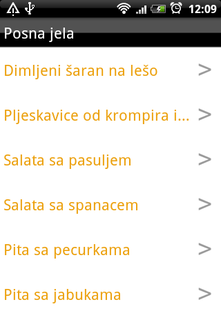 Posna jela: Dimljeni šaran na lešo, Pljeskavice od krompira i sira, Salata sa pasuljem, Salata sa spanacem, Pita sa pecurkama, Pita sa jabukama, Corba od praziluka i povrca, Potaz od povrca, Sote s pecurkama i pirincem, Supa od bukovace, Corba od kiselog kupusa, Rezanci sa orasima, Rezanci sa makom, Knedle sa sljivama, Prebranac, Krompir salata, Peceni harmonika krompir, Ruska salata, Predjelo od sociva, Salata od boranije, Bobove pihtije, Pasteta, Krompir sa sargarepom, Punjeni paradajz, Salata od susama, Salama, Kokos stangle, Paprike punjene pasuljom, Pecurke na rostilju, Snicla od spanaca, Suva pita od oraha, Riblje pecenje u vinu, Pita sa prazilukom, Posne kifle, Suva paprika sa orasima