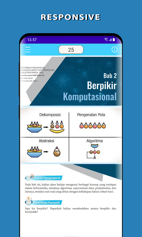 Buku Siswa Informatika Sekolah Menengah Pertama Kelas 7 Kurikulum Merdeka untuk merealisasikan program di tingkat satuan pendidikan. Aplikasi ini di buat untuk memudahkan siswa belajar dimana saja dan kapan saja.
