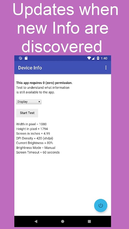 Aplikasi ini akan memberikan informasi tentang perangkat Android ™ Anda menggunakan semua API, pintasan, dan metode penyelesaian masalah yang tersedia, tetapi tanpa izin Android ™. Ini adalah alat untuk memungkinkan pengguna atau pengembang memahami risiko pencurian informasi dan privasi informasi yang ada bahkan di aplikasi tanpa izin apa pun.