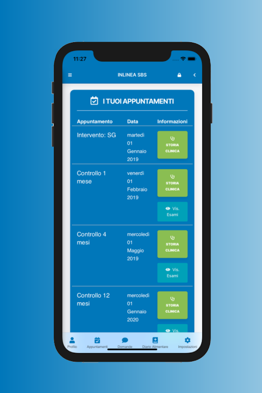App creata per chi è stato sottoposto ad un intervento di chirurgia bariatrica. Assiste il paziente nel suo percorso post-operatorio minotorando l’andanento del peso corporeo, ricordando gli appuntamenti delle visite di controllo, aiutando a registrare la dieta da seguire e offrendo un servizio di consulenza diretta con l’equipe.