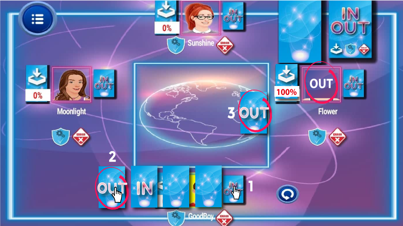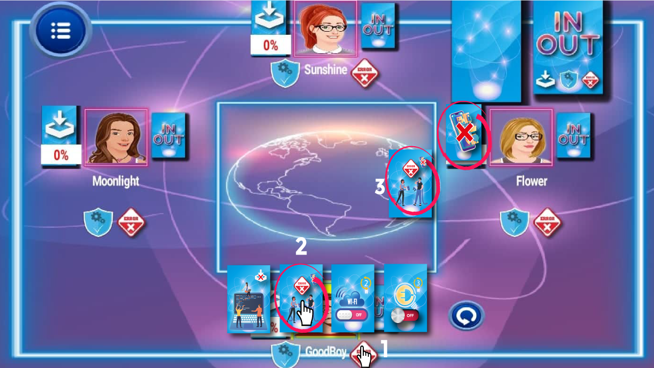 Ini adalah permainan di mana pemain terhubung ke jaringan virtual simulasi internet, masing-masing dari mereka dapat memiliki Kartu Keunggulan dan Kartu Kesalahan. Dengan Kartu Kesalahan, seorang Pemain dapat mengganggu sistem lawan, dan dengan Kartu Keunggulan, ia dapat bertahan melawan kesalahan. Setiap Pemain dapat mengunduh Aplikasi simulasi, dan dengan Aplikasi ini, ia dapat memiliki Kartu yang paling dicari, yaitu Kartu InOut di mana Kartu OUT mengeliminasi lawan, dan Kartu IN yang membuatnya tetap dalam permainan. Dan kita tidak dapat melupakan Lucky Call yang menawarkan Kartu InOut kepada Anda. Semoga berhasil!