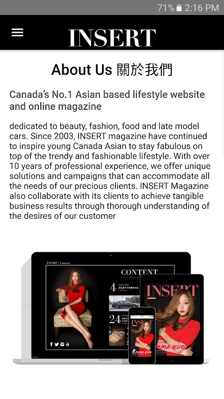 Canada's No.1 Asian based lifestyle website and online magazine dedicated to beauty, fashion, food and late model cars. Since 2003, INSERT magazine have continued to inspire young Canada Asian to stay fabulous on top of the trendy and fashionable lifestyle.