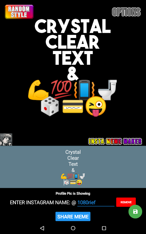 Simple, fast, easy to use text editor for creating Memes. Developed especially for Instagram users. You can enter you Instagram screen name to insert your profile picture into your meme. Also feature a Random Style Button which chooses a unique color/font combination each time it is pressed.