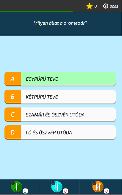 - több ezer érdekes kérdés 4 lehetséges válasszal. Minden kérdés egy helyes válasszal rendelkezik.