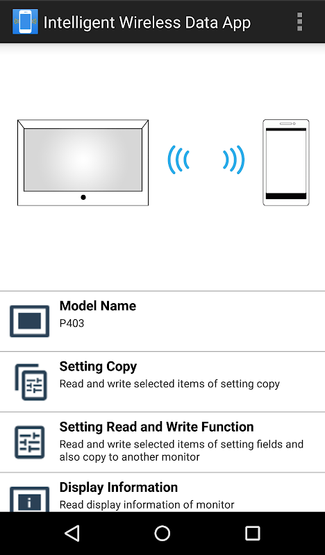 Intelligent Wireless Data App is an application software for reading and writing adjustment values and setting values using the Intelligent Wireless Data sensor of a NEC Displays and a terminal equipped with a NFC sensor (smartphone or tablet PC).
