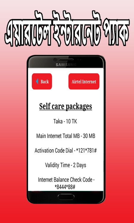 ” Internet Package airtel – এয়ারটেল ইন্টারনেট প্যাক” আমাদের এ এ্যাপস টিতে এয়ারটেল সিমের সকল নতুন আপডেট বিভিন্ন ইন্টারনেট প্যাকেজ এর তথ্য দিয়ে সাজানো হয়েছে। আপনাদের আর কষ্ট করে দোকানদার দের বলতে হবে না শুধু মাত্র আমাদের এ এ্যাপস আপনার মোবাইল এ থাকলে আপনি নিজে নিজেই বিভিন্ন ইন্টারনেট প্যাকেজ নিতে পারবেন অতি সহজেই । যেভাবে ইন্টারনেট নিবেন , প্র্রথমে কোন প্যাকেজ টি নিবেন তা দেখুন, এবং সে প্যাকেজ টির activation code Dial এর উপর চেপে ধরে কোডটি সিলেট করে তা Copy করে ,আপনার মোবাইলের Keypad এ তা Paste করুন । তাহলে নির্দিষ্ট পরিমান ইন্টারনেট প্যাকেজ টি পেয়ে যাবেন । আপনার পছন্দের যেকোন প্যাকেজ টি নিতে চাইলে এ্যাপসটির মধ্যে দেখুন। অনেক গুলো প্যাকেজ দিয়ে আমাদের এ এ্যাপস টি সাজানো হয়েছে।
