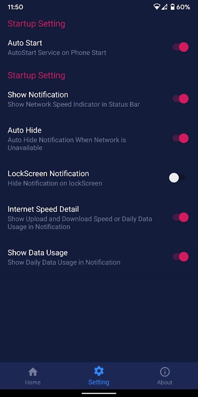 You can customize almost everything you want. Easily show and hide the indicator if needed. Decide for you where you want to show the indicator in the status bar, whether it should be shown on lockscreen or whether you want to use bytes per second (e.g. kBps) or bits per second (e.g. kbps) to show the speed.