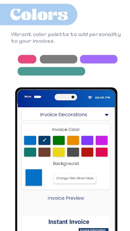 - Tersedia berbagai warna faktur yang dapat dipilih. Anda dapat memilih salah satu yang paling sesuai dengan bisnis Anda. Warna background dan gambar background invoice juga banyak. Anda juga dapat menambahkan gambar latar belakang Anda sendiri.