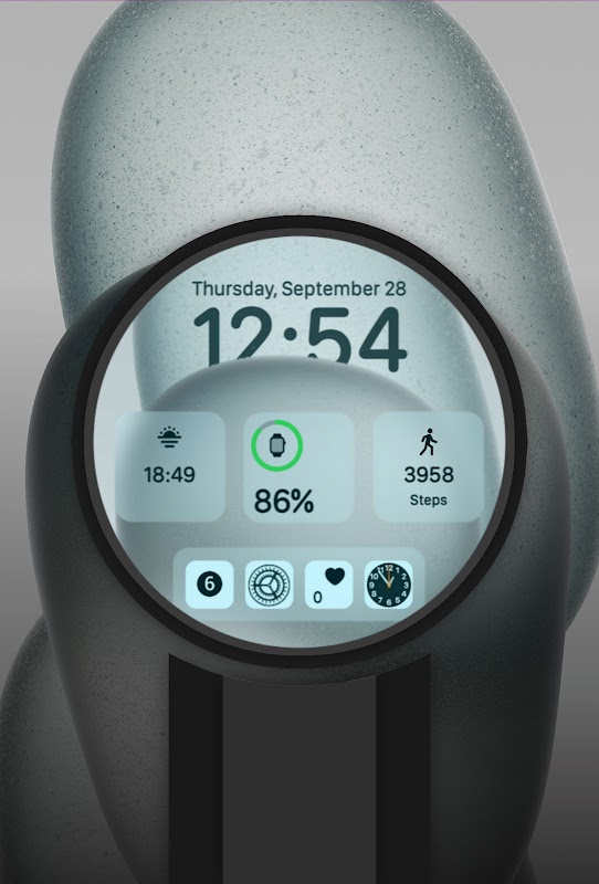 ◉ Dock aplikasi dengan pengaturan yang berputar, ikon jam yang berfungsi, dan ikon kesehatan