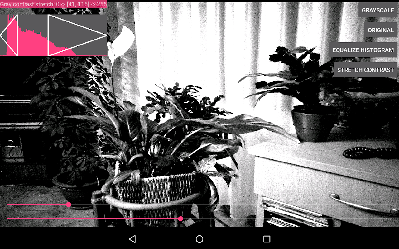 Aplikasi ini visualisasi operator histogram menggunakan perpustakaan OpenCV. Kita dapat memilih dari warna atau grayscale live view, dan histogram mereka menyamakan kedudukan dan kontras membentang versi. Untuk warna, gambar pertama dikonversi ke ruang warna YCrCb dan operator histogram dihitung untuk Y (grayscale) channel.