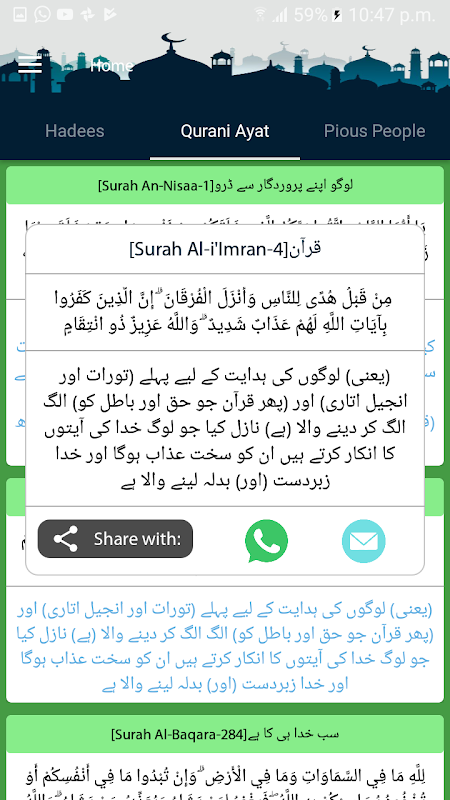 ♢ There are three options on the homepage. First one is about Hadith, second Qur'anic verses with Urdu translation and the third one is about sayings from prophets and famous Islamic scholars. New items will be uploaded daily on the homepage.