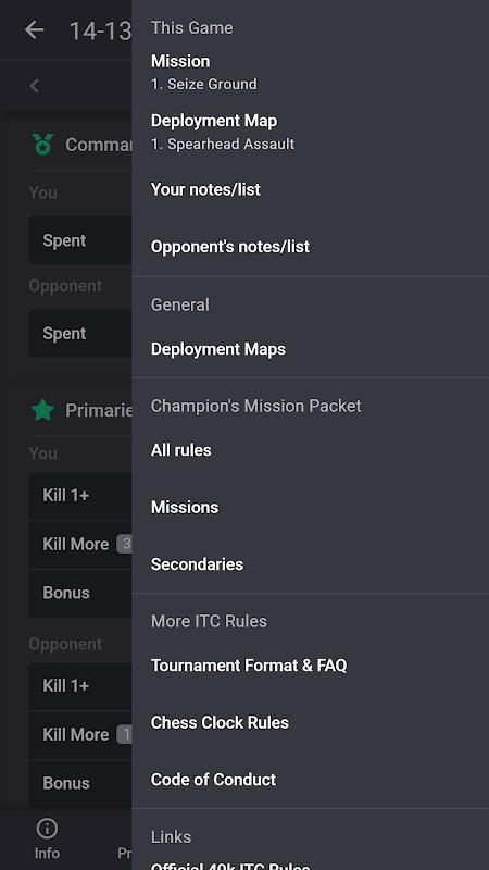Fitur lain termasuk melacak Poin Perintah, menyelamatkan Anda dan faksi lawan Anda, daftar, dan semua catatan untuk referensi, melacak persentase kemenangan Anda, dan referensi aturan ITC tambahan seperti aturan Jam Catur dan Kode Etik.