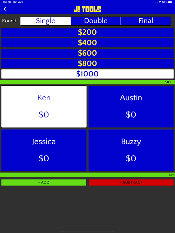 * Quickly score any number of players' single, double, and final Jeopardy answers.