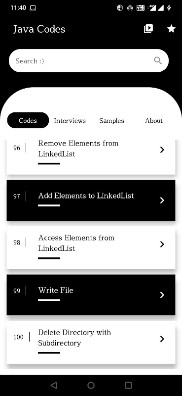 - Three Modules : Codes, Interviews and Samples for better learning.