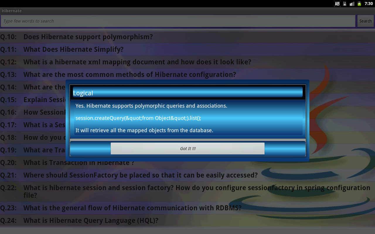 This app is helpful for Interview appearing candidates who wants to became a Java Software engineer. There are around 800+ Questions of different variety and categories.