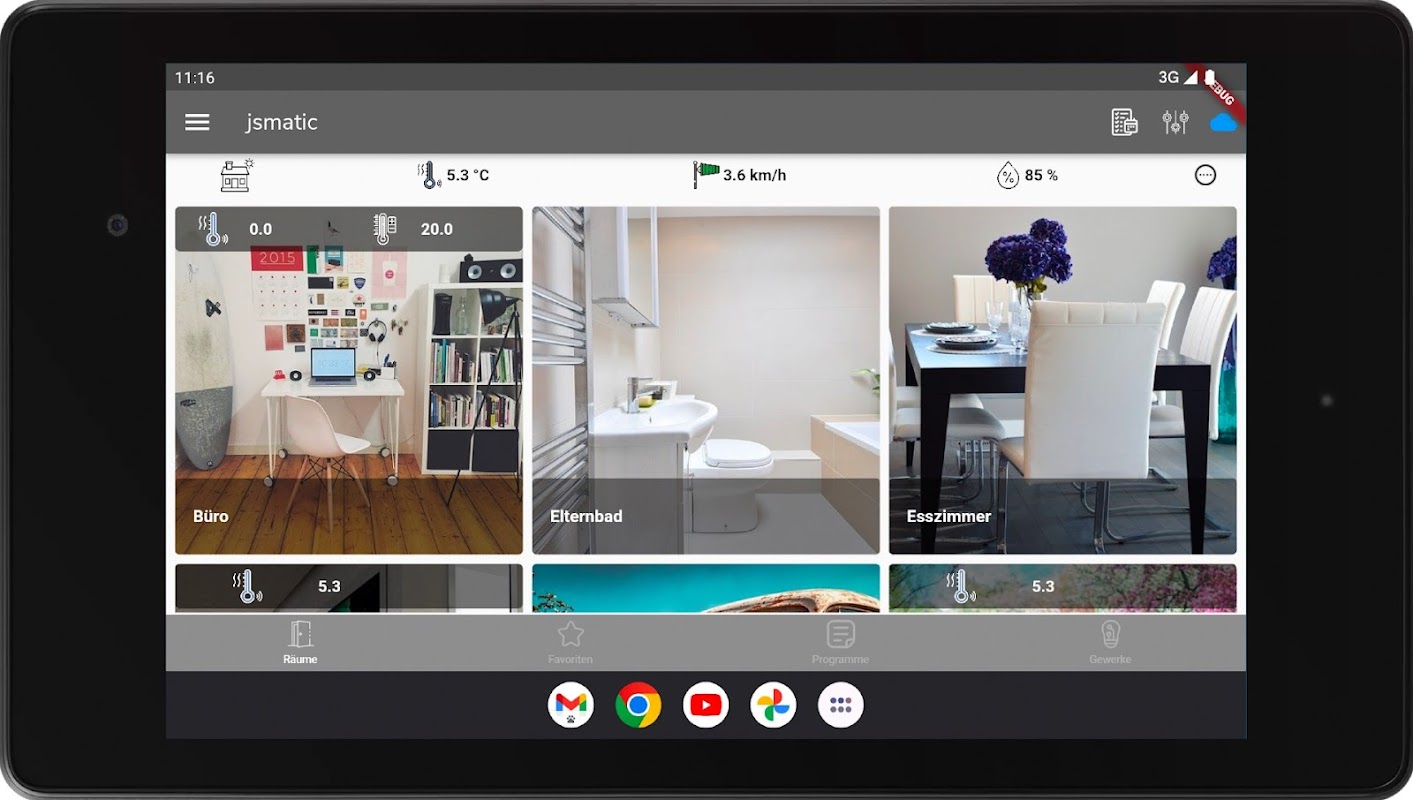 jsmatic memerlukan CCU1, CCU2, CCU3 atau RaspberryMatic. jsmatic tidak berafiliasi dengan eQ-3. Untuk informasi lebih lanjut kunjungi www.tinymatic.de