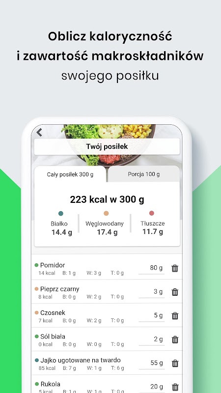 - Perhitungan cepat dari nilai kalori makanan - apakah Anda memerlukan informasi cepat tentang nilai kalori makanan Anda? Atau mungkin satu porsi? Dengan aplikasi kami, Anda akan dengan mudah mendapatkan semua informasi yang diperlukan.