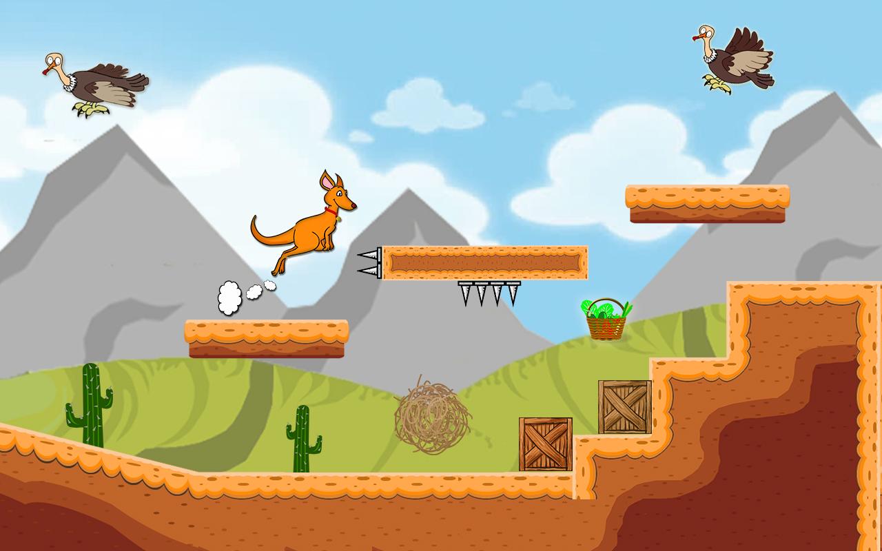 The world of this 2D game is set in the vast land of wild African jungles and the scorching deserts of Australia. Take control of a wild kangaroo who got separated from its family and herd. The goal of the game is to reach your family while avoiding obstacles and enemy predators in your way.