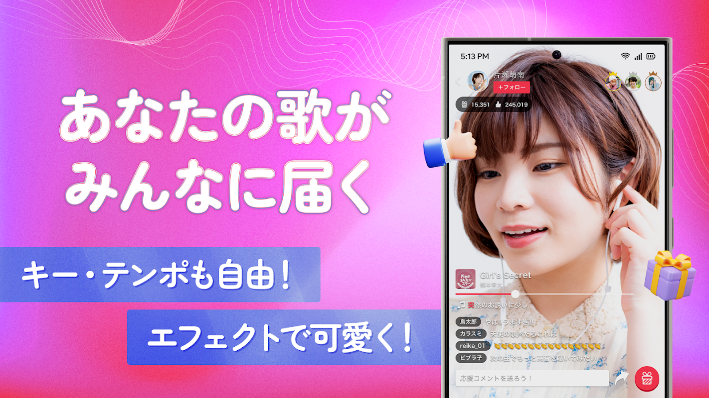 Karaoke sepuasnya! Anda dapat membuat video diri Anda bernyanyi dalam hitungan detik! Bersemangatlah dengan streaming langsung!