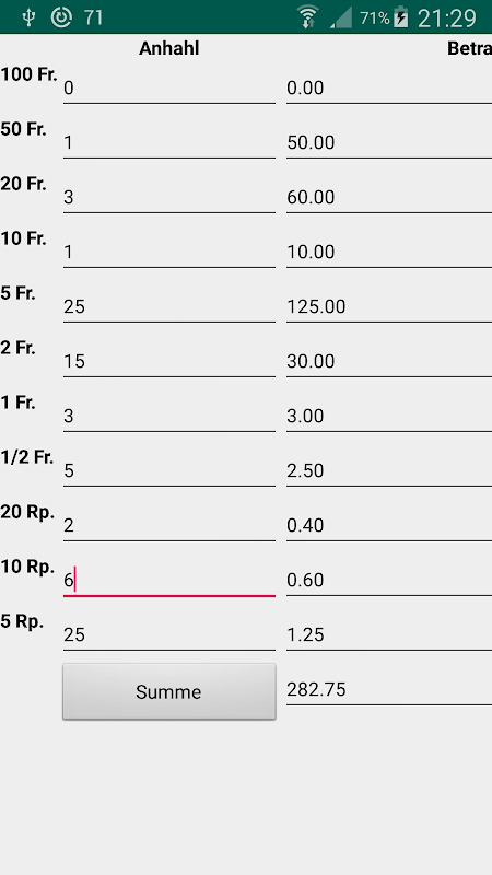 Dengan aplikasi ini, permainan anak-anak untuk menentukan isi mesin kasir. Aplikasi ini melakukan semua perhitungan. Anda hanya perlu menghitung. Hal ini membuat menentukan isi mesin kasir menjadi sangat menyenangkan. Mengklik tombol “Jumlah” akan memicu seluruh perhitungan.