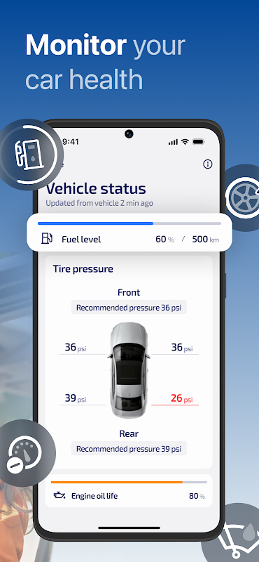 - Periksa status mesin kendaraan secara langsung dari jarak jauh: Tekanan ban, level oli, bahan bakar, bensin, atau kondisi baterai EV.