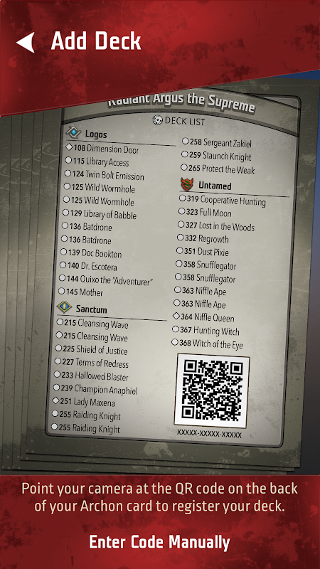 Dunia Crucible menanti! KeyForge: Master Vault adalah aplikasi pendamping penting untuk Game Dek Unik pertama di dunia dari Fantasy Flight Games! Gunakan aplikasi untuk memindai kode QR dek Anda atau masukkan kode 15 karakternya (keduanya ditemukan di bagian belakang kartu Archon dek Anda). Setiap dek yang Anda masukkan akan ditetapkan ke akun Asmodee.net Anda sehingga Anda dapat melihat isinya dan mengikuti kinerjanya dalam Permainan Terorganisir.