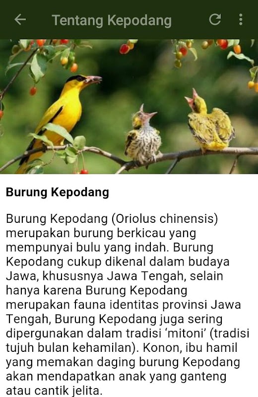 Aplikasi ini berisi kicauan burung kepodang yang merdu dan pengetahuan tentang kepodang. Kicauan ini juga dapat digunakan untuk melatih burung, isian maupun untuk hiburan. Happy fun...