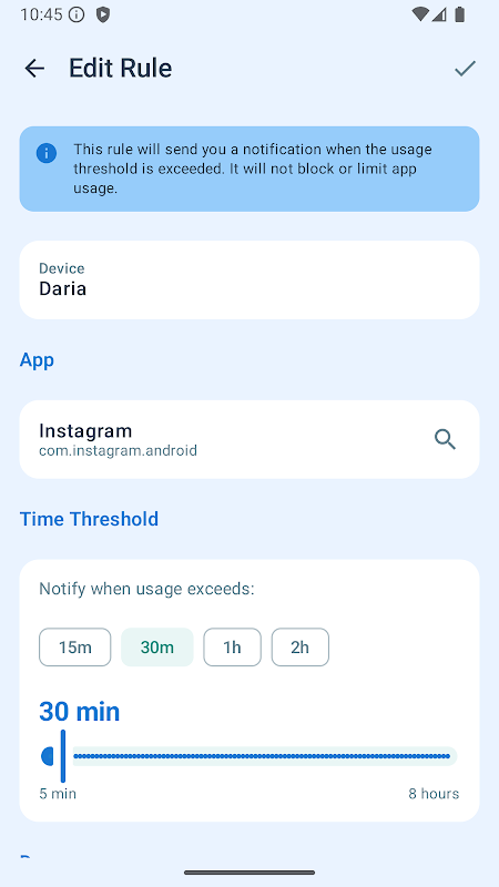 • Peringatan hanya berdasarkan durasi penggunaan aplikasi atau status pelacakan