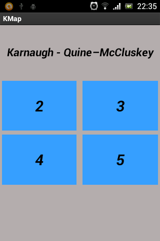 KMAP adalah aplikasi yang memungkinkan Anda untuk belajar, berlatih dan memverifikasi penggunaan metode untuk menyederhanakan peta Karnaugh (juga dikenal sebagai tabel atau diagram Veitch Karnaugh). Untuk menghitung ekspresi minimum atau solusi didasarkan pada algoritma Quine-McCluskey.