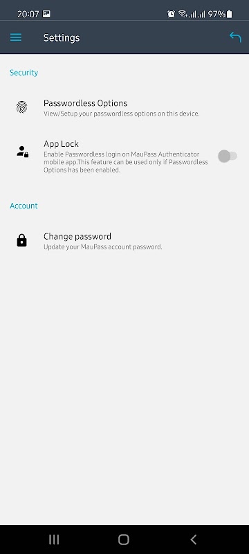 Untuk mengizinkan login pada aplikasi seluler MauPass melalui autentikasi Tanpa Kata Sandi, Anda perlu membuka aplikasi seluler MauPass, membuka Pengaturan dan mengaktifkan Kunci Aplikasi.
