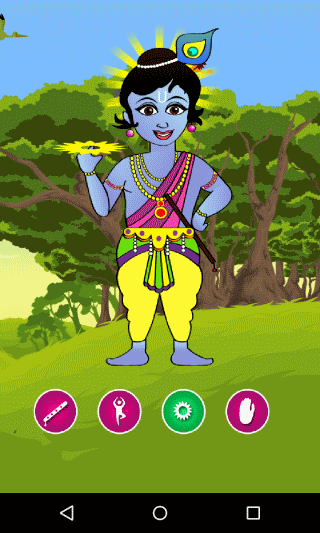 Krishna sering digambarkan dan digambarkan sebagai mentega bayi makan, anak muda bermain seruling, anak muda bersama dengan Radha atau tua memberikan bimbingan dan arahan kepada Arjuna. Di sini, di aplikasi ini kita akan memerankan Krishna sebagai anak yound bermain flute.