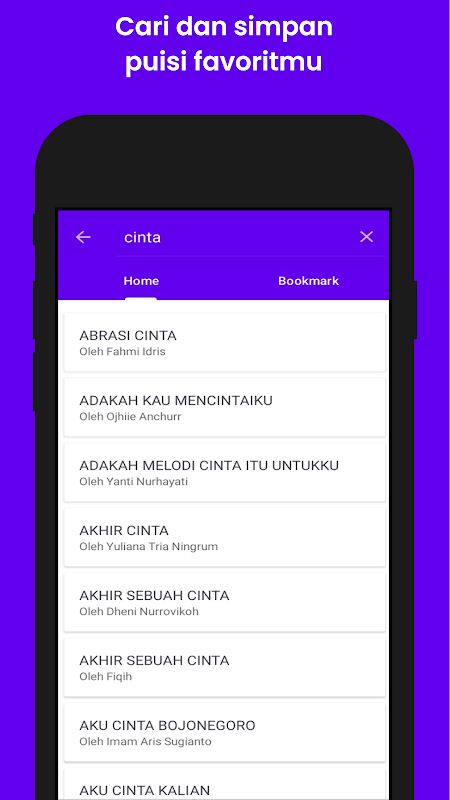 Cari puisi dan simpan ke dalam daftar bookmark untuk membuat kumpulan puisi yang disukai atau ingin dibaca nanti.