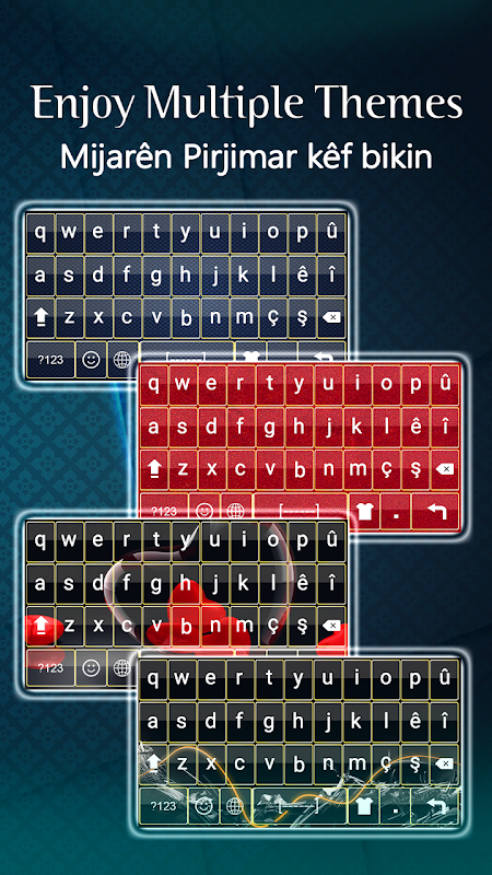Kurdi & Inggris, kedua keyboard QWERTY sangat mudah digunakan untuk pengguna keyboard. Keyboard Kurdi - Keyboard Mengetik Kurdi adalah keyboard mengetik cepat dan gaya unik keyboard mengetik tombol Kurdi dan Inggris untuk android. Keyboard Kurdi - Keyboard Mengetik Kurdi ramah pengguna, input pengetikan cepat dan skema warna yang menarik. Nikmati aplikasi keyboard ini dengan tema yang indah dengan tombol bergaya. Keyboard Kurdi - Keyboard Mengetik Kurdi atau keyboard Kurdi untuk android yang akan muncul setelah Anda memilihnya sebagai aplikasi keyboard default dari metode masukan bahasa. Keyboard ini akan muncul setiap saat saat mengetik. Mudah menulis semua huruf Kurdi & huruf Inggris.
